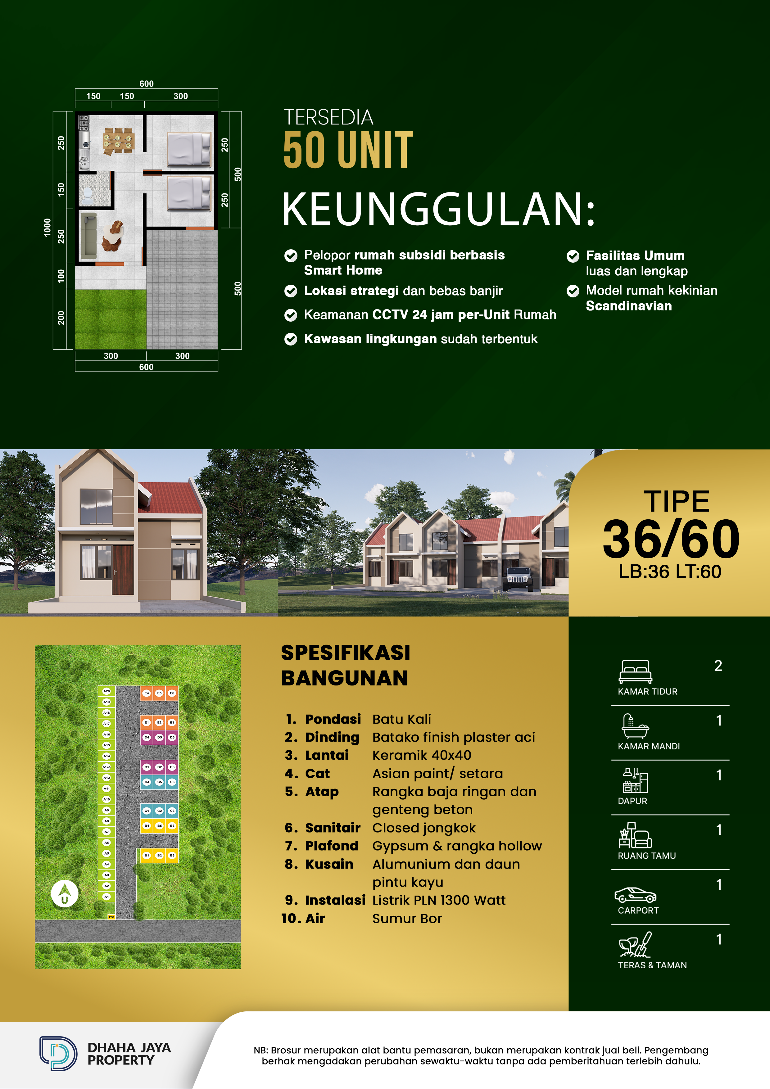 Setiap unit rumah dibangun dengan tipe 36/60, menghadirkan ruang yang cukup untuk tumbuh bersama keluarga. Di dalamnya tersedia dua kamar tidur yang dirancang nyaman dengan pencahayaan alami, menciptakan ruang istirahat yang sehat dan menyenangkan. Sementara itu, satu kamar mandi dengan tata ruang sederhana memberikan fungsi praktis dan mudah dirawat. Hunian ini juga dilengkapi dengan ruang tamu yang lapang sebagai pusat berkumpul dan tempat menyambut tamu, serta dapur yang tertata rapi dan efisien untuk mendukung aktivitas sehari-hari. Bagian depan rumah memiliki teras yang memberikan kesan hangat sekaligus area santai, ditambah dengan carport yang aman untuk kendaraan pribadi.